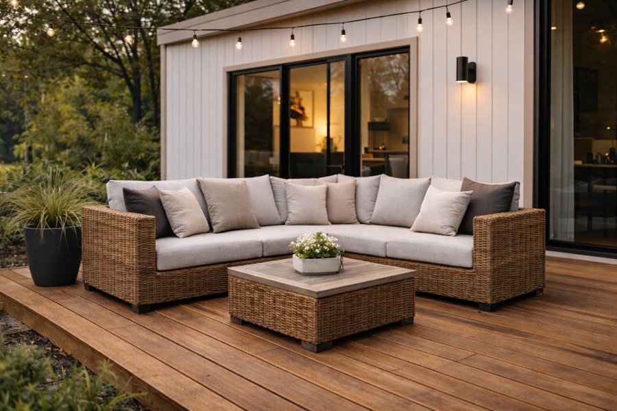 L şeklindeki modern oturma grupları, konteyner evin verandasında ya da geniş bahçe köşelerinde oldukça estetik bir görünüm sağlar. Bu takımlar hem geniş oturma alanı sunar hem de mekânı olduğundan daha düzenli gösterir.