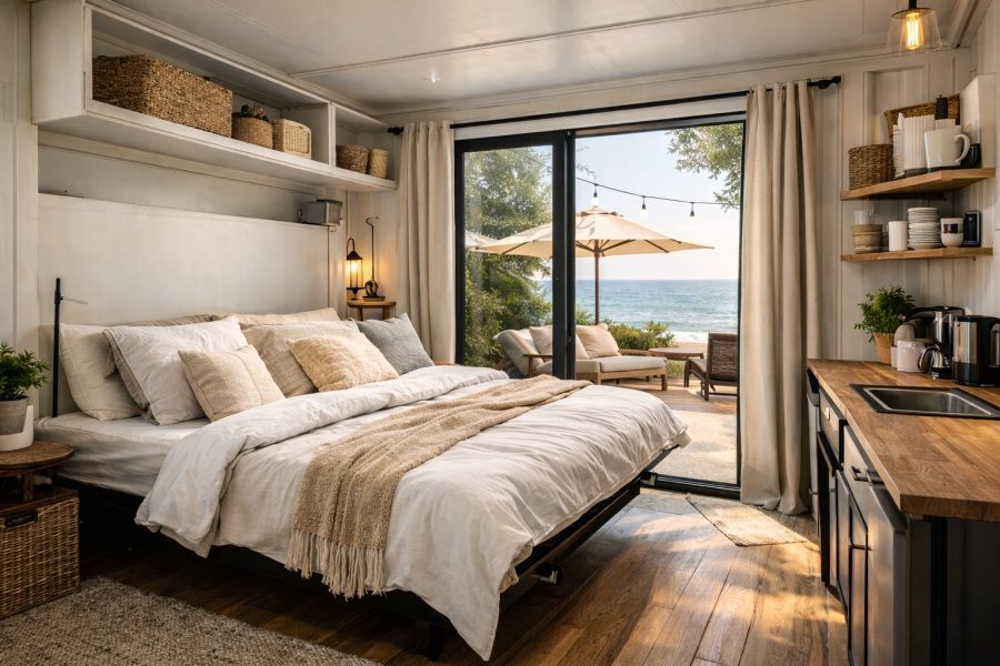 Bambu lambalar, dokuma kilimler, deniz temalı aksesuarlar ve rengârenk minderler konteyner eve yazlık bir kimlik kazandırır. Küçük dokunuşlarla büyük bir değişim yaratmak mümkündür. Özellikle beyaz ve mavi tonları, yazlık evlerde ferahlatıcı bir etki yaratır.